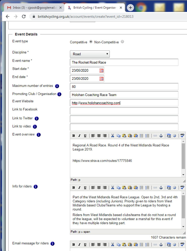 On the same page, go to ‘Event Details’ and fill out the various boxes. It will look something like the image at the bottom of this document. Make sure you add a publicly viewable ‘strava’ link to the course in the ‘Event Overview’ tab – e.g. https://www.strava.com/routes/11119992. You are ‘marketing’ your event to riders and asking for a fairly sizeable entry fee so it is imperative you make it easy for the end user to gather the information they require prior to entering the event. The more informative you make it, the more entries you will receive!